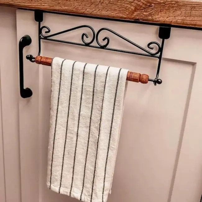 آویز حوله کابینتی یک انتخاب هوشمندانه برای آشپزخانههای مدرن و کلاسیک است. طراحی زیبا و مقاوم آن ترکیبی از فلز مشکی با طرحهای هنری و پایه چوبی طبیعی است که جلوهای خاص به فضای شما میبخشد. نصب آسان بدون نیاز به ابزار، تنها با آویزان کردن آن بر روی درب کابینت انجام میشود و فضای داخل آشپزخانه را بهینه میکند. مناسب برای نگهداری حوله، دستمال خشککن، دستمال سفره و حتی دستمال کاغذی.
